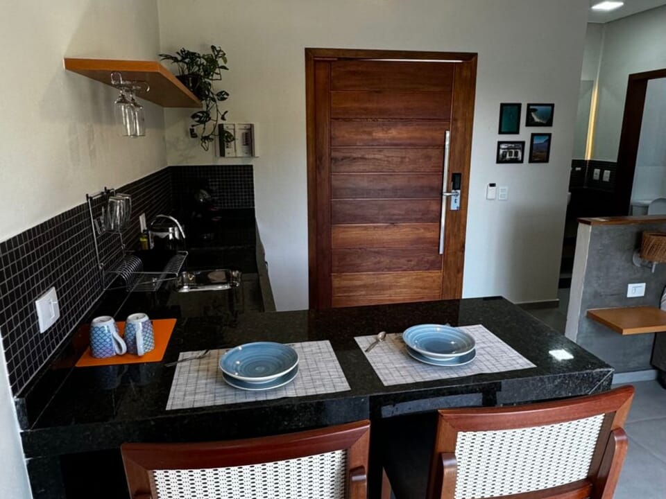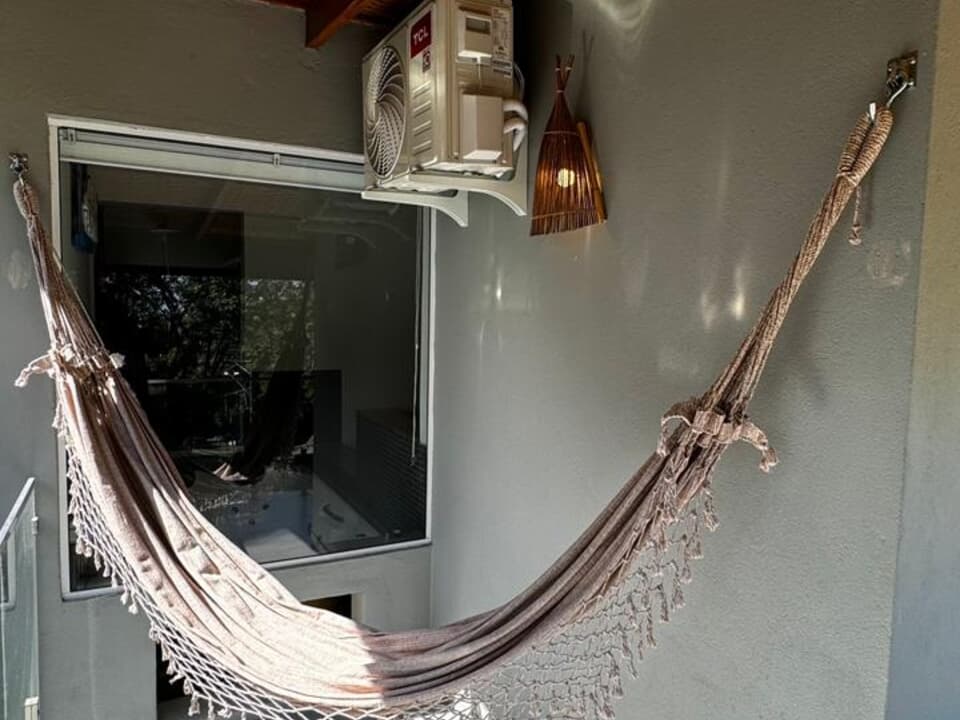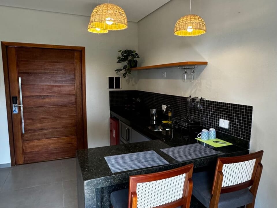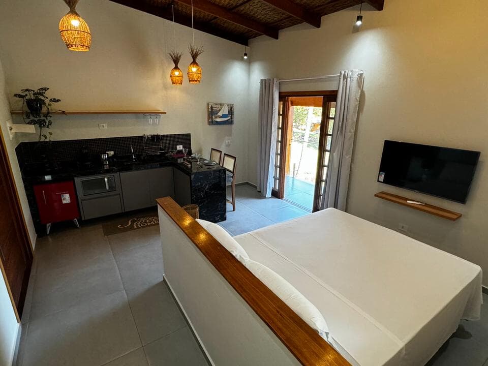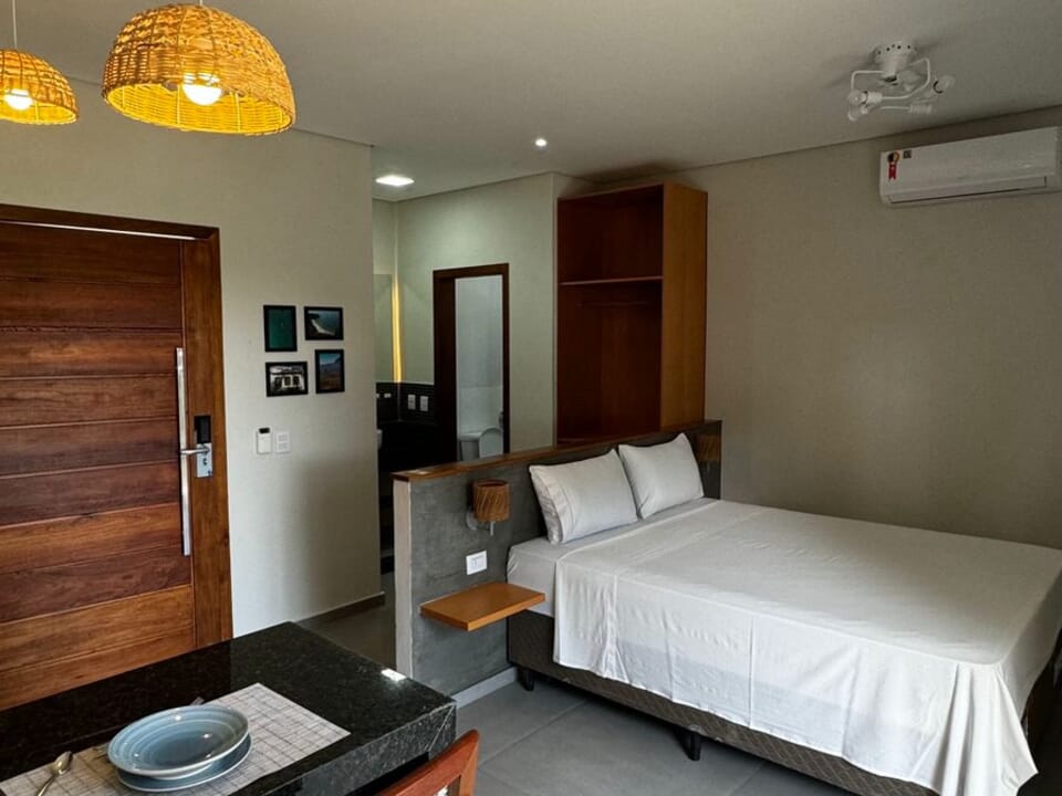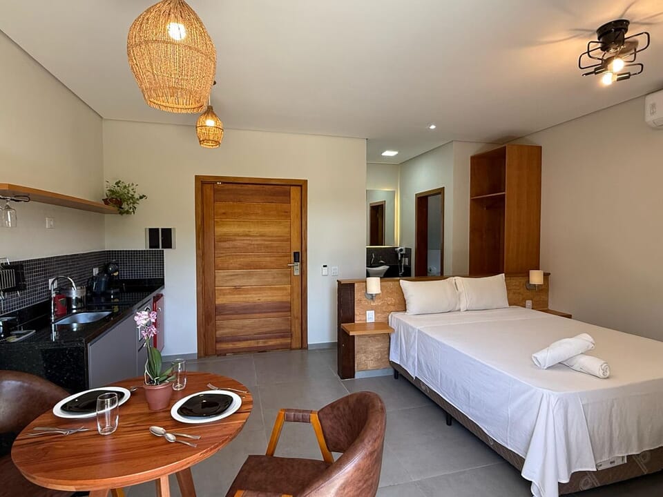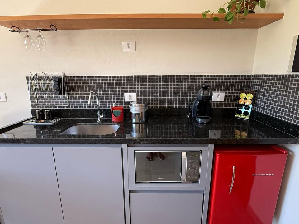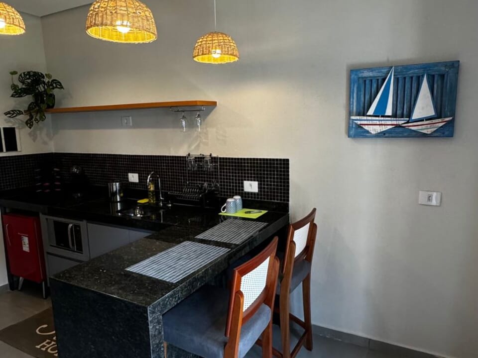 Equipado com uma cozinha compacta ( Pratos, talheres, copos e taças), micro-ondas, frigobar, cafeteira Dolce Gusto. Cama Queen super confortável, Tv 43" Smart, ventilador de teto, ar condicionado, guarda roupas, banheiro amplo, chuveiro elétrico e secador de cabelo. Linda sacada com cadeiras e rede para um momento relaxante.