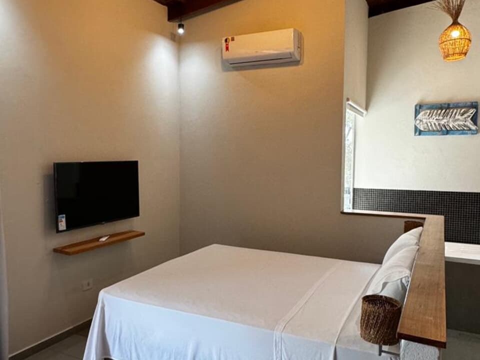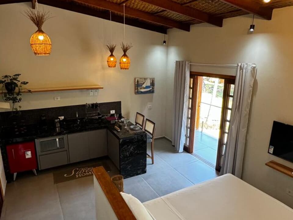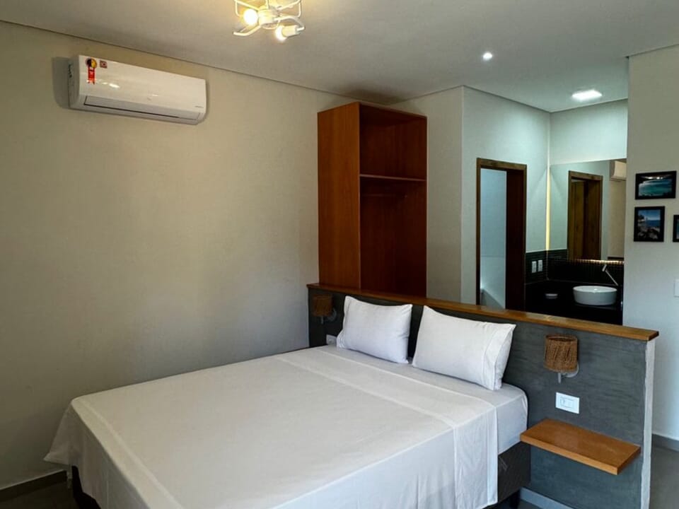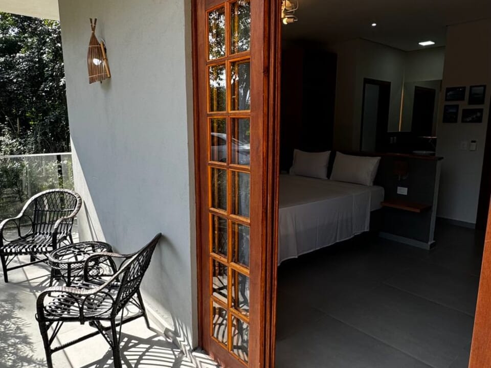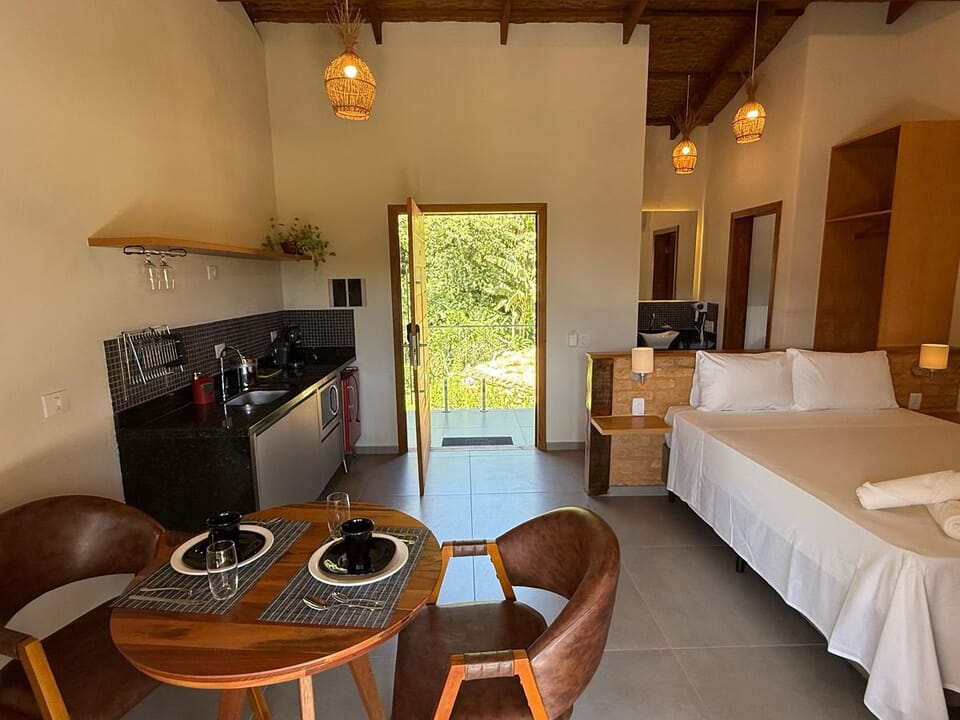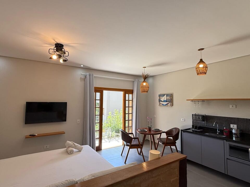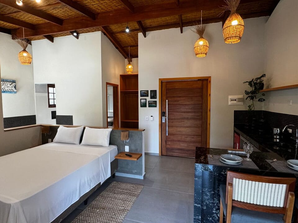 Equipado com uma cozinha compacta ( Pratos, talheres, copos e taças), micro-ondas, frigobar, cafeteira Dolce Gusto. Cama Queen super confortável, Tv 43" Smart, ventilador de teto, ar condicionado, guarda roupas, banheiro amplo, chuveiro elétrico e secador de cabelo. Linda sacada com cadeiras e rede para um momento relaxante.