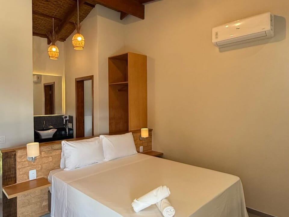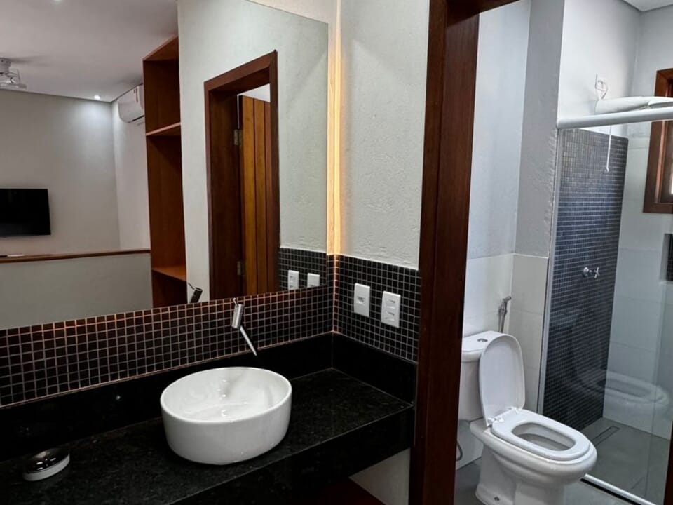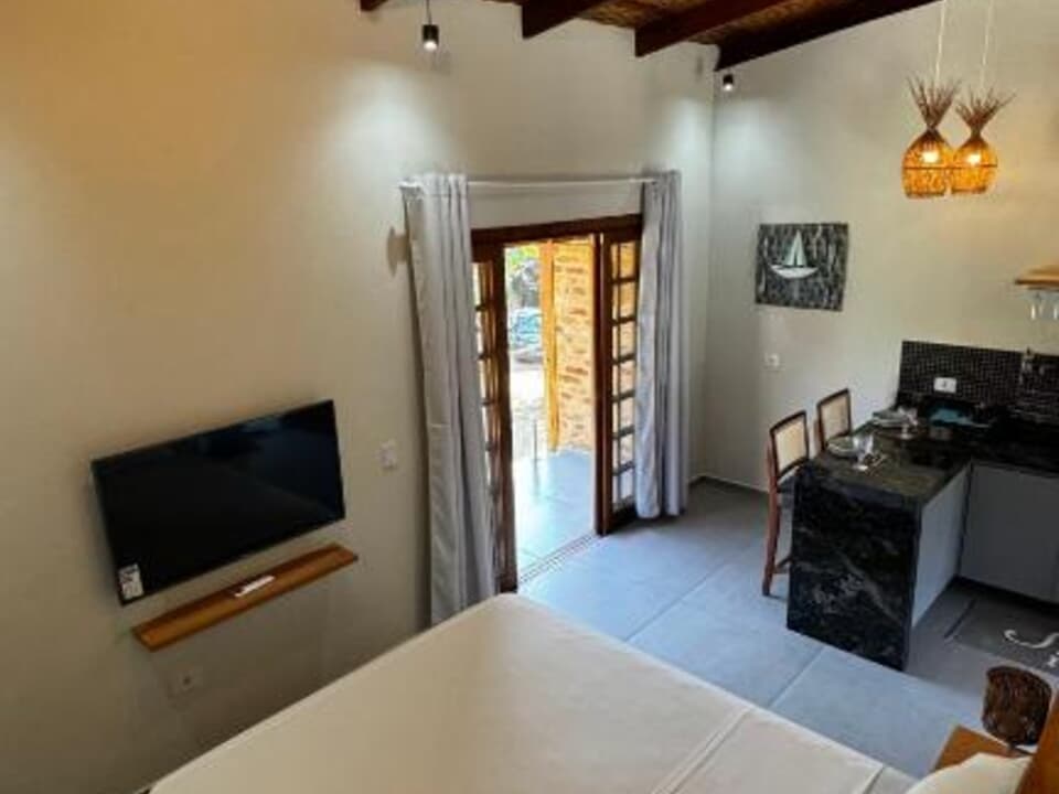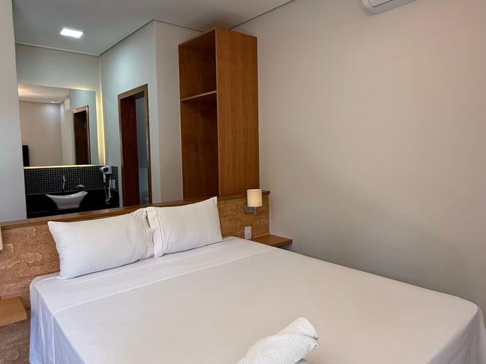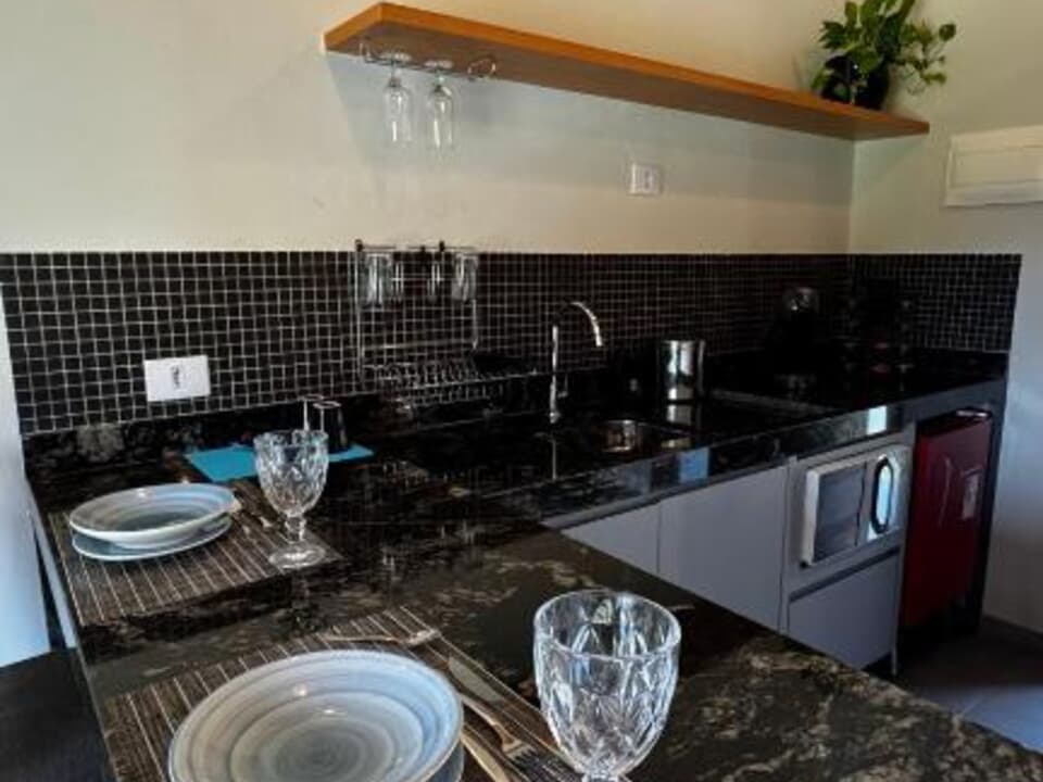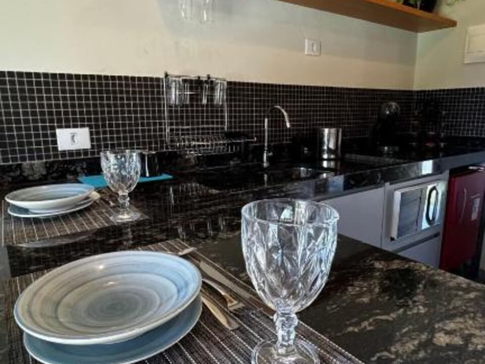 Equipado com uma cozinha compacta ( Pratos, talheres, copos e taças), micro-ondas, frigobar, cafeteira Dolce Gusto. Cama Queen super confortável, Tv 43" Smart, ventilador de teto, ar condicionado, guarda roupas, banheiro amplo, chuveiro elétrico, Secador de cabelo e banheira casal. Vista maravilhosa. Linda sacada com cadeiras e rede para um momento relaxante.